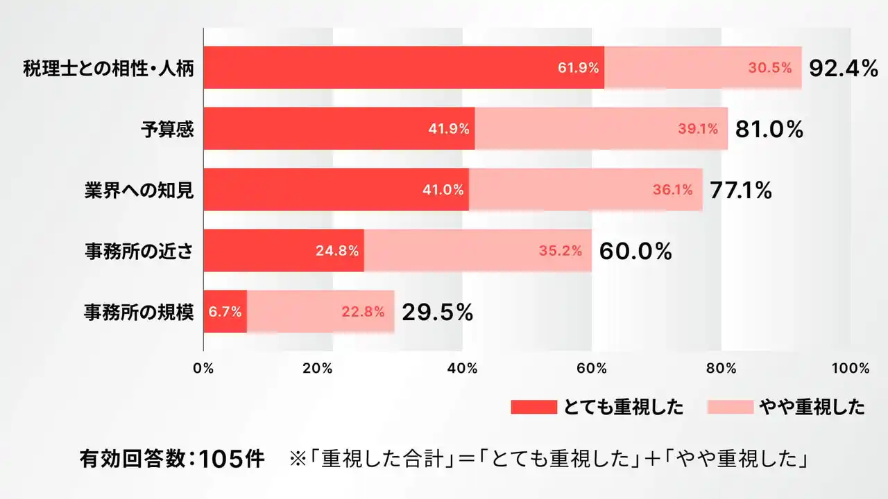 最も重視されたポイントは「税理士との相性・人柄」で、92.4%のお客様が重視したと回答(うち「とても重視した」は61.9%)。次いで「予算感」(81.0%)、「業界への知見」(77.1%)が続き、費用・専門性も重要視されていることがわかります。一方、「事務所の規模」は重視する割合が29.5%にとどまり、規模よりも"人"や"相性"が決め手となっています。 |