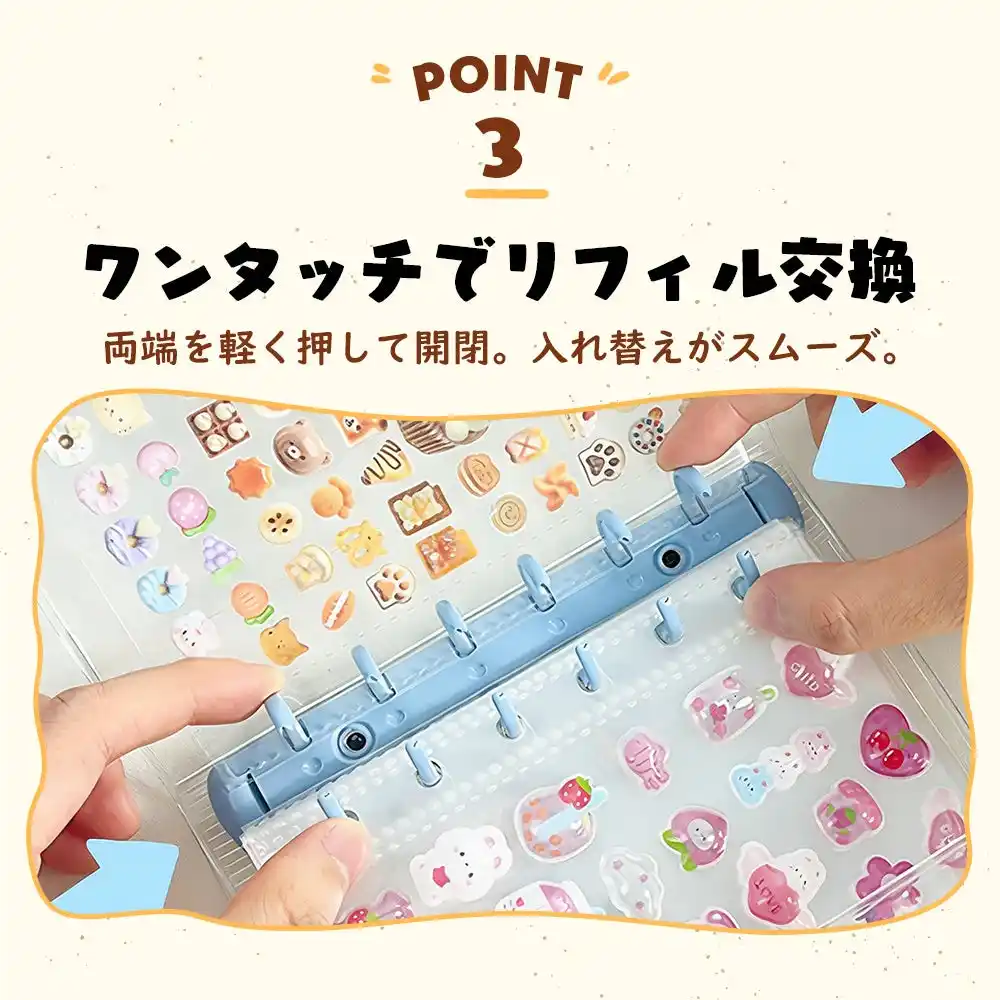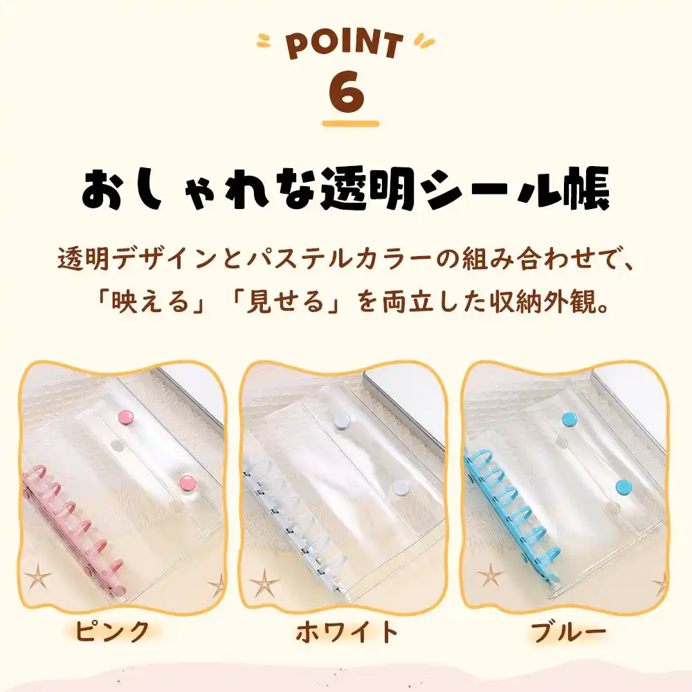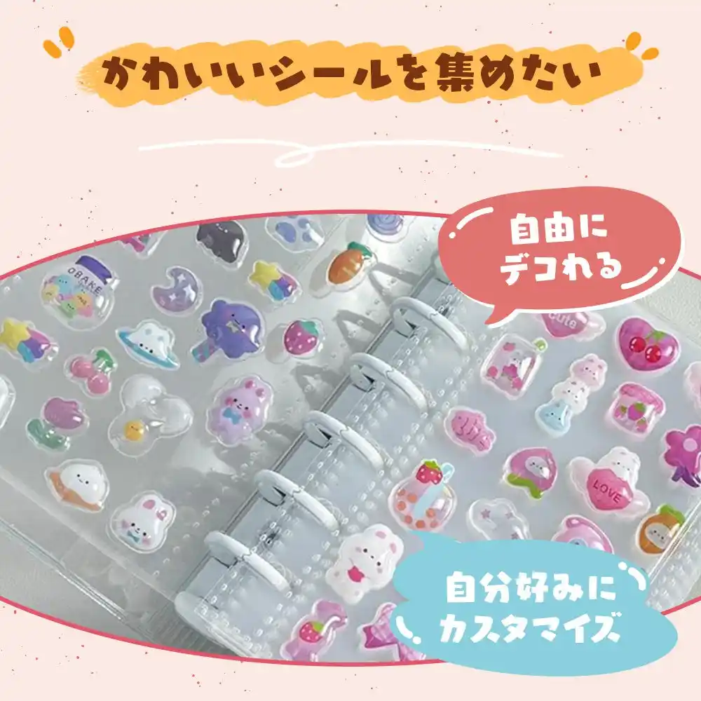 | 現在大流行中のシール収集や、推し活・トレカ収納など使い方自由自在。自由にカスタマイズして自分だけの1冊が作れる透明シール帳です。ホワイト、ピンク、ブルーの3色のバインダーをご用意。 |