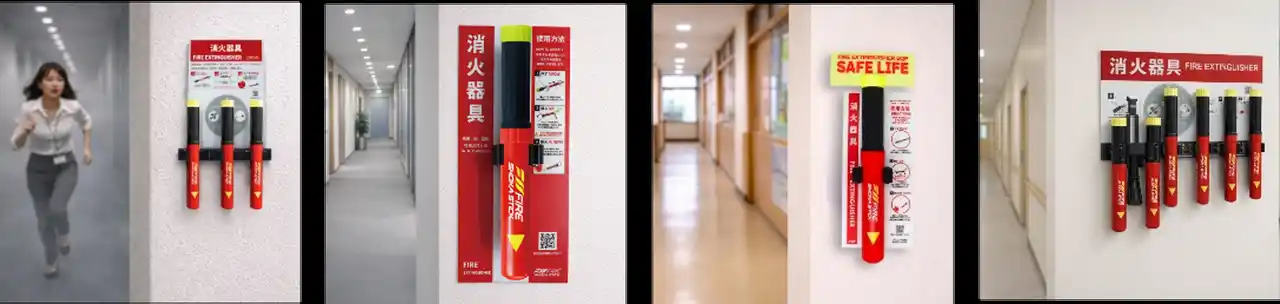 施設の規模や用途(オフィス、ホテル、学校、病院、住宅、工場など)に合わせ、FSS1本タイプ、3本タイプ、6本タイプ各種ホルダーと組み合わせて視認性と利便性を高める消火器具表示プレートの4種類パッケージを用意しています。 |