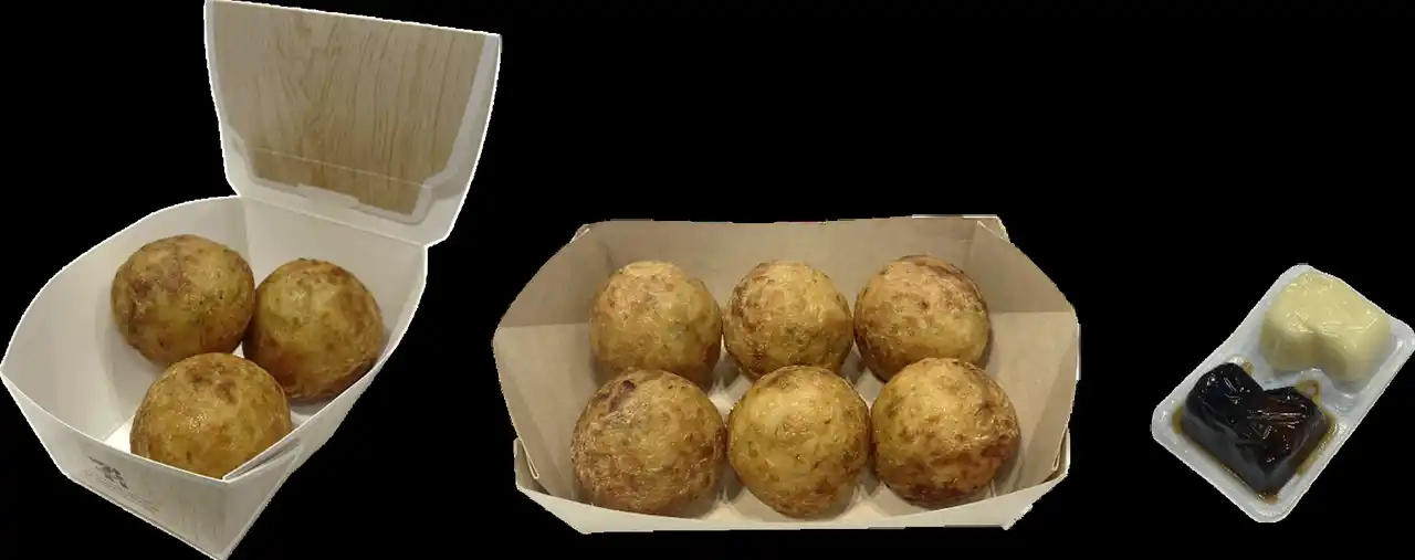カツオベースのコクのある出汁の生地で焼き上げ、仕上げにお店で揚げてから提供するため、できたてをお楽しみいただけます。ひと口食べた瞬間、風味豊かな出汁の旨みと、トロッとした食感を味わえる「揚げたこ焼き」に仕上げております。 |