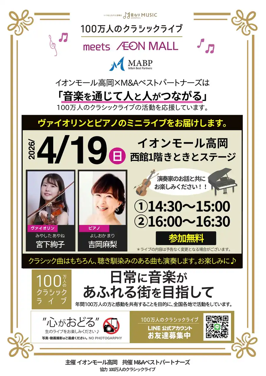 | 製造、建設、不動産、医療・ヘルスケア、物流、ITに特化したM&A仲介を行う株式会社M&Aベストパートナー(本社:東京都千代田区、代表取締役社長:齋藤 達雄 以下M&Aベストパートナーズ)と、一般財団法人100万人のクラシックライブ(東京都千代田区、代表理事:蓑田秀策 以下100万人のクラシックライブ)は、4月19日(日)14:30/16:00より、イオンモール高岡にて、クラシックライブを開催することをお知らせいたします。 | ||||||||||