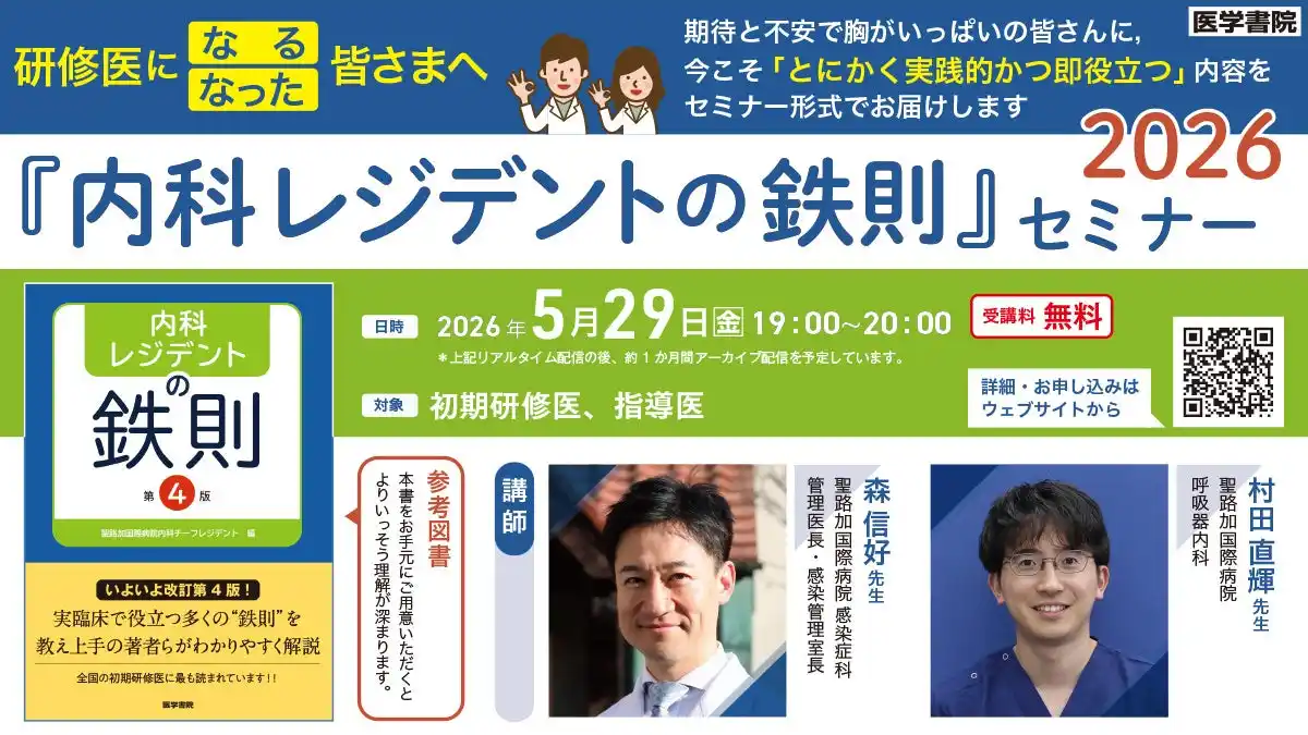 | 株式会社医学書院 (所在地:東京都文京区、代表取締役社長:金原 俊)は、この春に研修医になった医師および指導医に向けた無料Webセミナー「『内科レジデントの鉄則』セミナー2026」を5月29日に開催します。 | |||||||||||||||||
