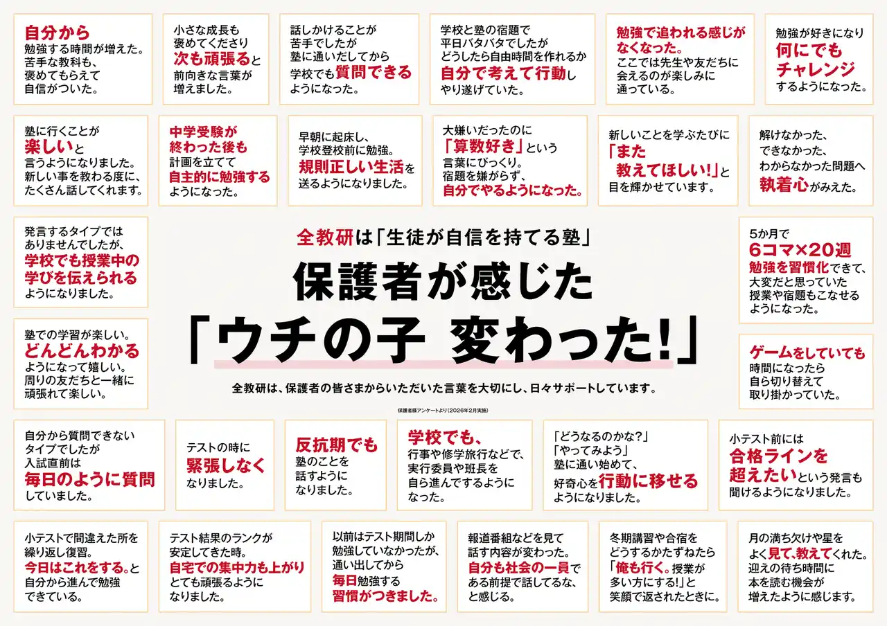 第1弾では、保護者約670名に実施した「お子さまがこれまで全教研に通われていて変わったと思われた瞬間を教えてください。」というアンケートに対して、「中学受験が終わった後も計画を立てて自主的に勉強するようになった。」や「自分から質問できないタイプでしたが、入試直前は毎日のように質問していました。」など、成績向上といった実態ではなく、生徒の自律や行動変容に対して成長を感じたという回答を多数頂きました。 |