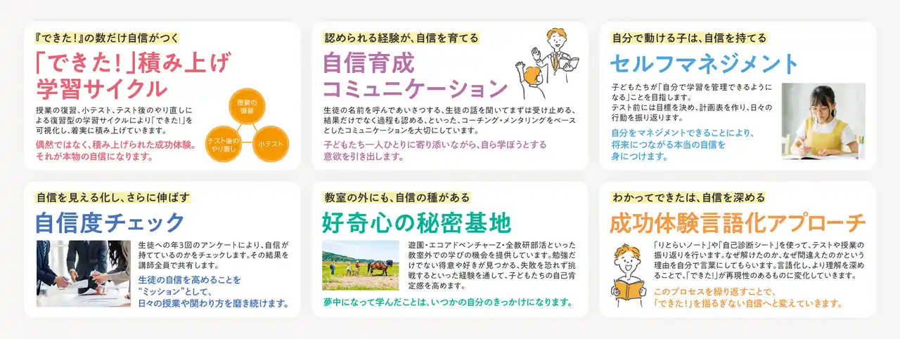 こうした調査結果をもとに、全教研では生徒の自信を育てるため「6つの取り組み」を柱にサポートしています。 |