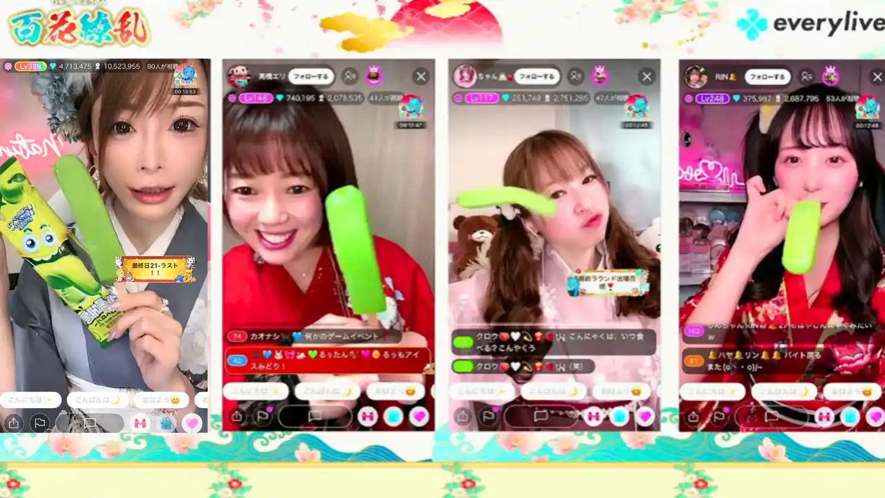 | 「超超祭」は、everylive内イベントを勝ち抜いた人気ライバーが集結し、会場でパフォーマンスを行う夏祭りイベントです。 | ||||||||