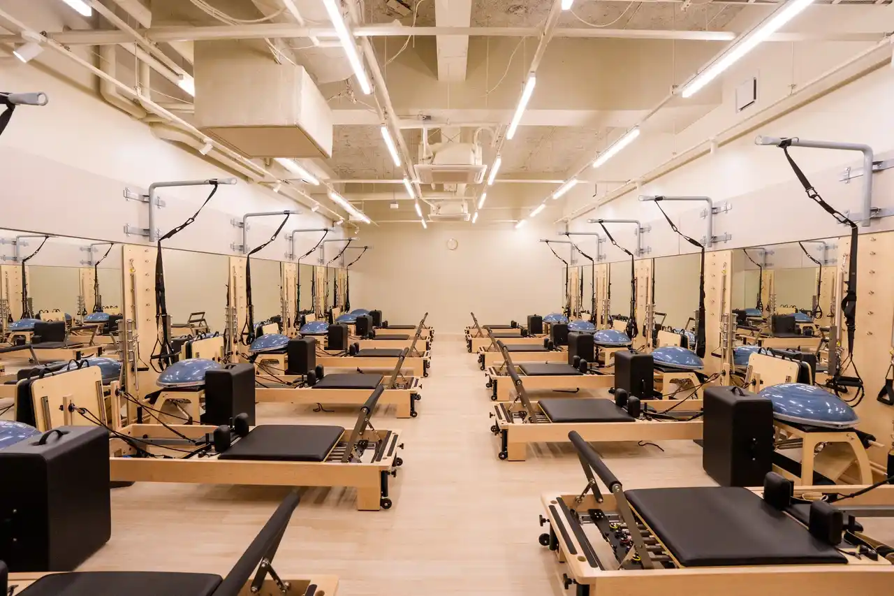 | スタジオ内は、リフォーマーと呼ばれるピラティスマシン12台に加え、チェア、TRX、スパインコレクター、フォームローラー、ハーフバランスボールなどの大小様々なピラティス専用器具を完備。 | ||||||||||||||||||