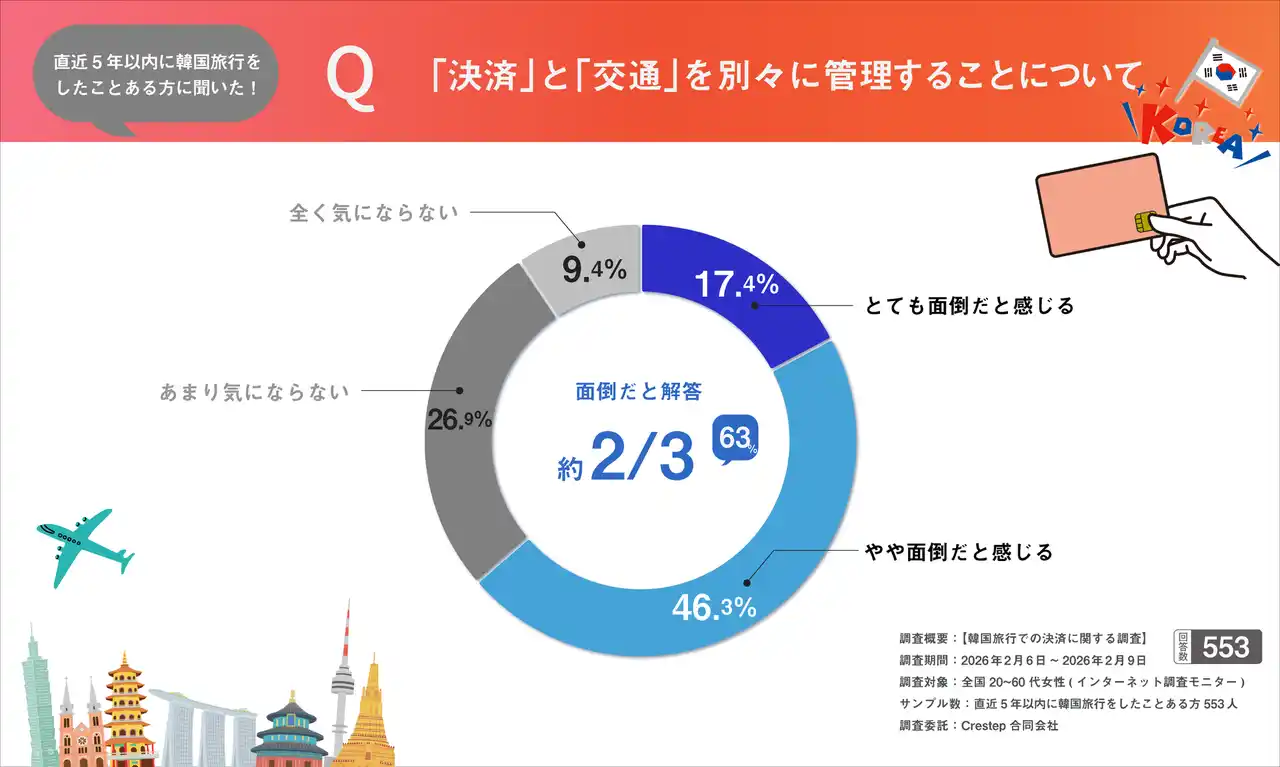調査名:【韓国旅行での決済に関する調査】 調査期間:2026年2月6日~2026年2月9日 調査対象:全国/20~60代/女性(インターネット調査モニター) 有効回答数:直近5年以内に韓国旅行をしたことがある553人 調査実施:Crestep合同会社 |
