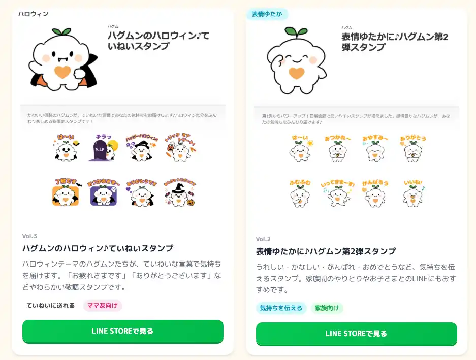 4. LINEスタンプで毎日の会話にハグムンを LINE STOREにてVol.5まで販売中。日常会話で使いやすいやさしいスタンプが揃っています。 |