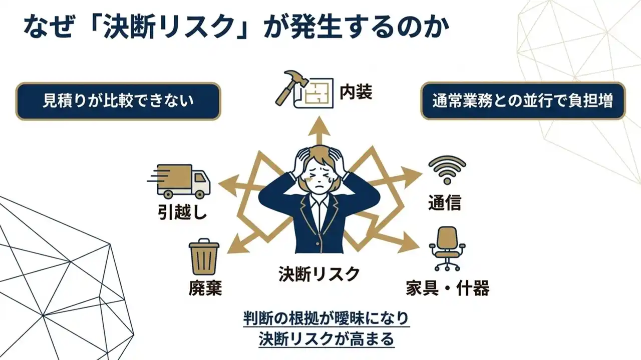 | オフィス移転において、総務・管理部門の担当者が直面するのは、「不透明な根拠で意思決定を迫られる構造」です。 | |||