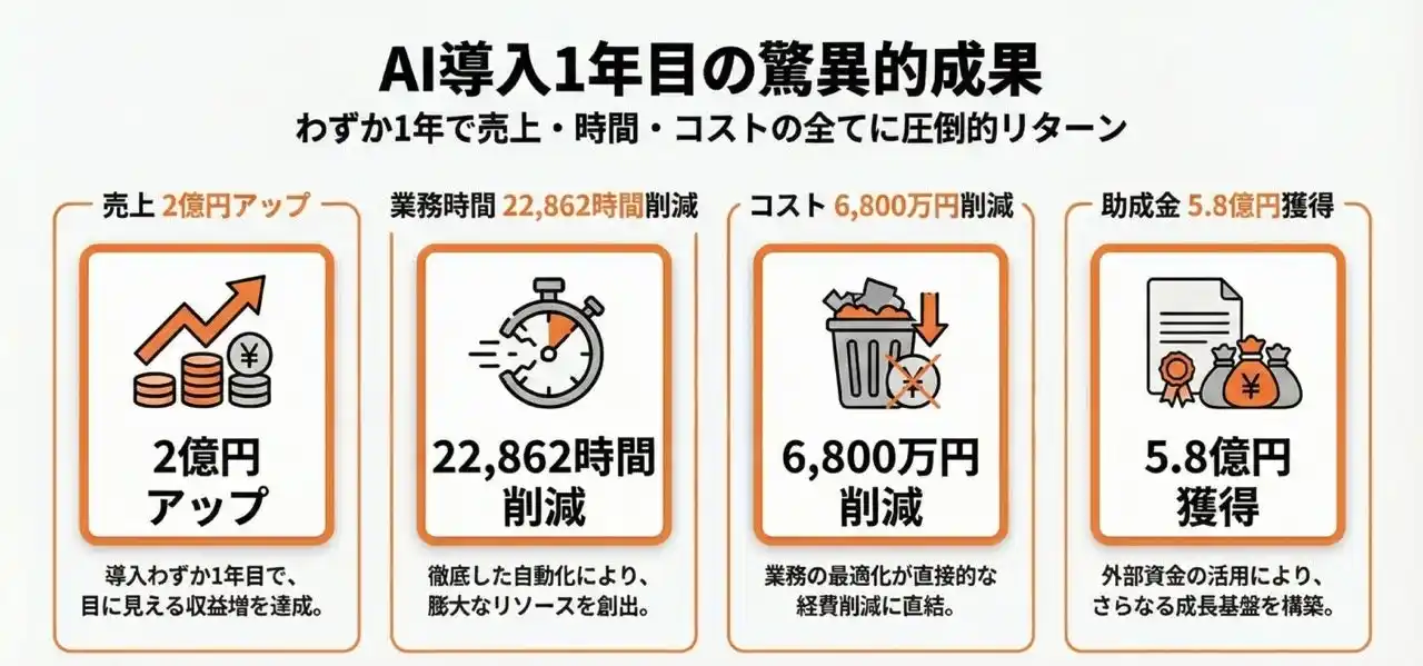 導入後は「全ての業務にAIを」というスローガンのもと、毎朝の全社朝礼での事例共有や定例勉強会などAIの浸透/活用を徹底した結果、導入わずか1年目で売上2億円増・業務時間22,862時間削減・コスト6,800万円削減・助成金5.8億円獲得という大きな成果を得られました。 |
