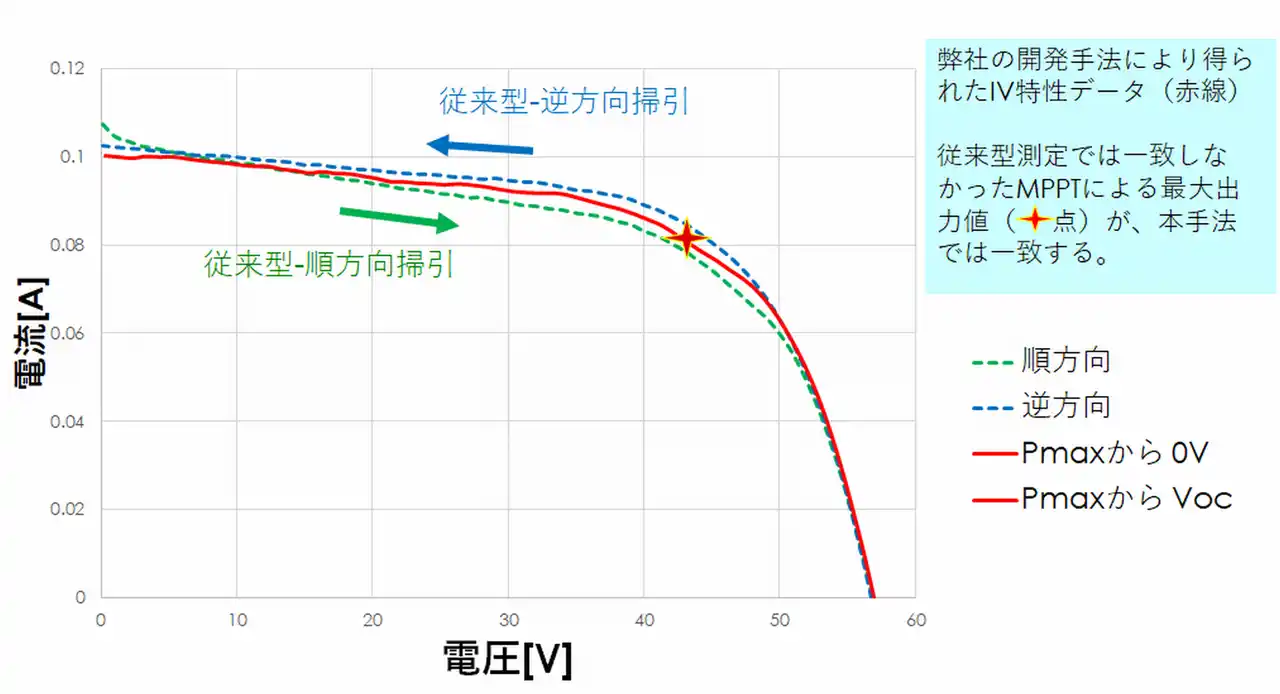 従来型I-V特性測定(両方向の掃引において、Pmax値が一致しない場合があることが課題となっている) |