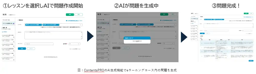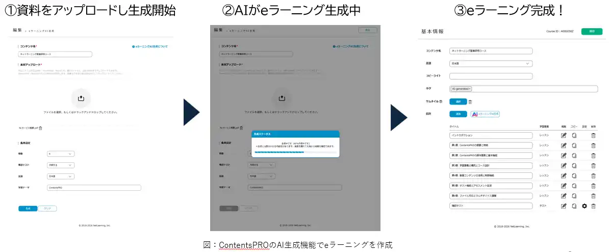 | 株式会社ネットラーニング(本社:東京都、代表取締役会長CEO:岸田 努)は、累計導入社数7,569社、累計学習者数約1億1,750万人の実績を持つ教育サービスの提供を通じて培ったノウハウをもとに、eラーニングコンテンツ内製化サービス「ContentsPRO」において、AIを活用した新機能「eラーニングAI生成機能」を2026年4月14日に販売開始およびリリースいたします。また、既に提供中の「AI作問補助機能」との連携により、コンテンツ制作から問題作成までを効率化するAI支援環境を実現しました。 | |||