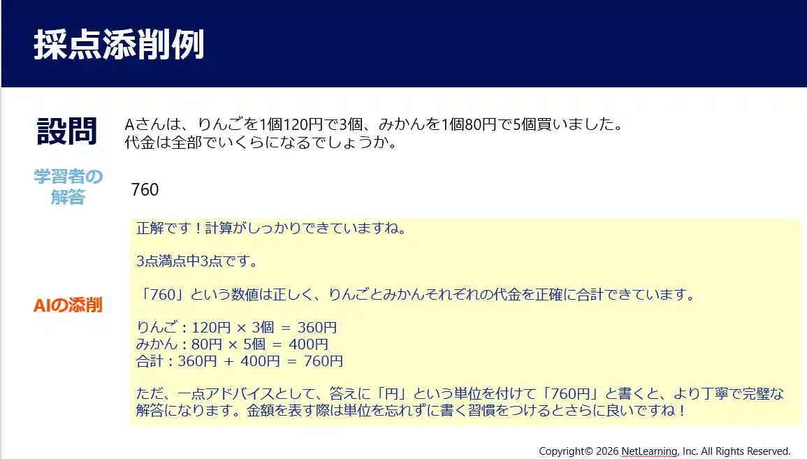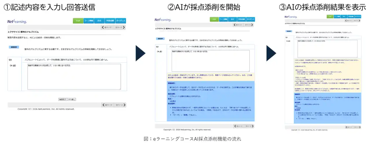 | さらに、当社が提供するeラーニングコースにおいては、新たに「自由記述設問のAI採点添削機能」を2026年4月14日より販売開始し、4月末日より順次提供開始いたします。これにより、記述式問題の採点・添削を24時間365日実施可能とし、学びの高度化に対応します。 | |||