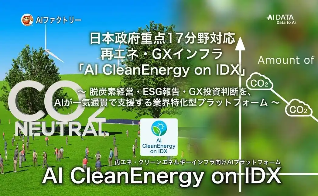 企業データとAIの利活用カンパニー、AIデータ株式会社(本社:東京都港区、代表取締役社長 佐々木隆仁、以下AIデータ社)は、日本政府が推進するGX(グリーントランスフォーメーション)重点17分野に対応した、再エネ・クリーンエネルギーインフラ向けAIソリューション 『AI CleanEnergy on IDX』 の正式提供を開始いたしました。 |