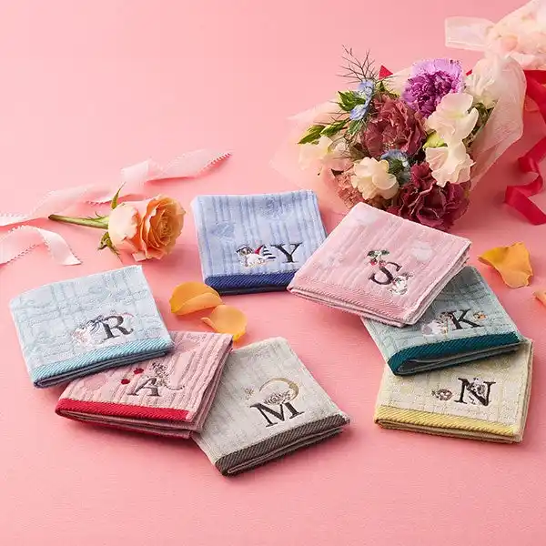 アルファベットの一つひとつに、動物たちの小さなストーリーを添えたイニシャルシリーズ。綿100%のふんわりとした肌当たりの生地で、大切な方へのギフトにもおすすめなアイテムです。イニシャルは、M/Y/A/S/N/R/Kの計7種類から1枚お選びいただきます。 |