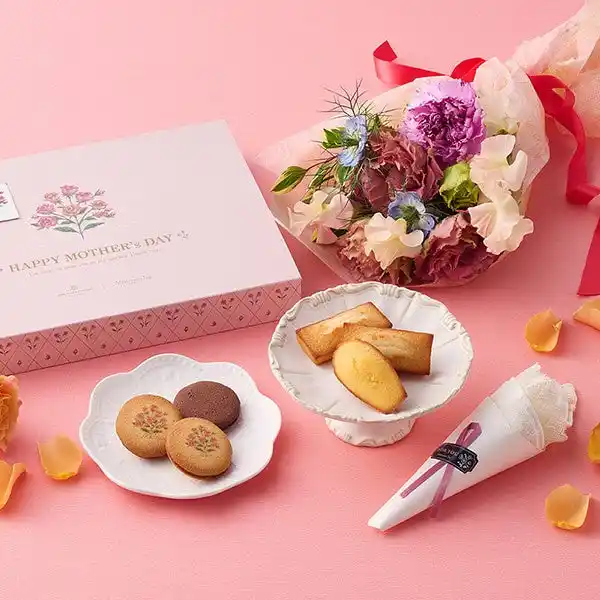 【内容】フィナンシェ3個、マドレーヌ3個、ラング・ド・シャ(フードプリント)〈Thank you Mother〉5個、〈チョコレート〉5個、Afternoon Tea LIVING ブーケミニタオル1枚、メッセージカード1枚 |