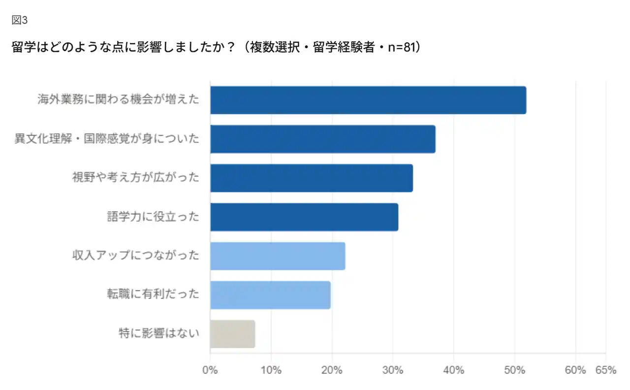最も多かった回答は「海外業務に関わる機会が増えた(51.9%)」。「語学力が業務に役立った(22.2%)」の2倍以上に達し、留学が「スキル習得」にとどまらず、国際的な業務への関与機会を増やしている事実が明らかになりました。留学経験者の課長以上比率が非経験者の約2倍(42.0% vs 21.5%)というデータと重ね合わせると、留学が実際の職位獲得に影響している構造が示唆されます。 |