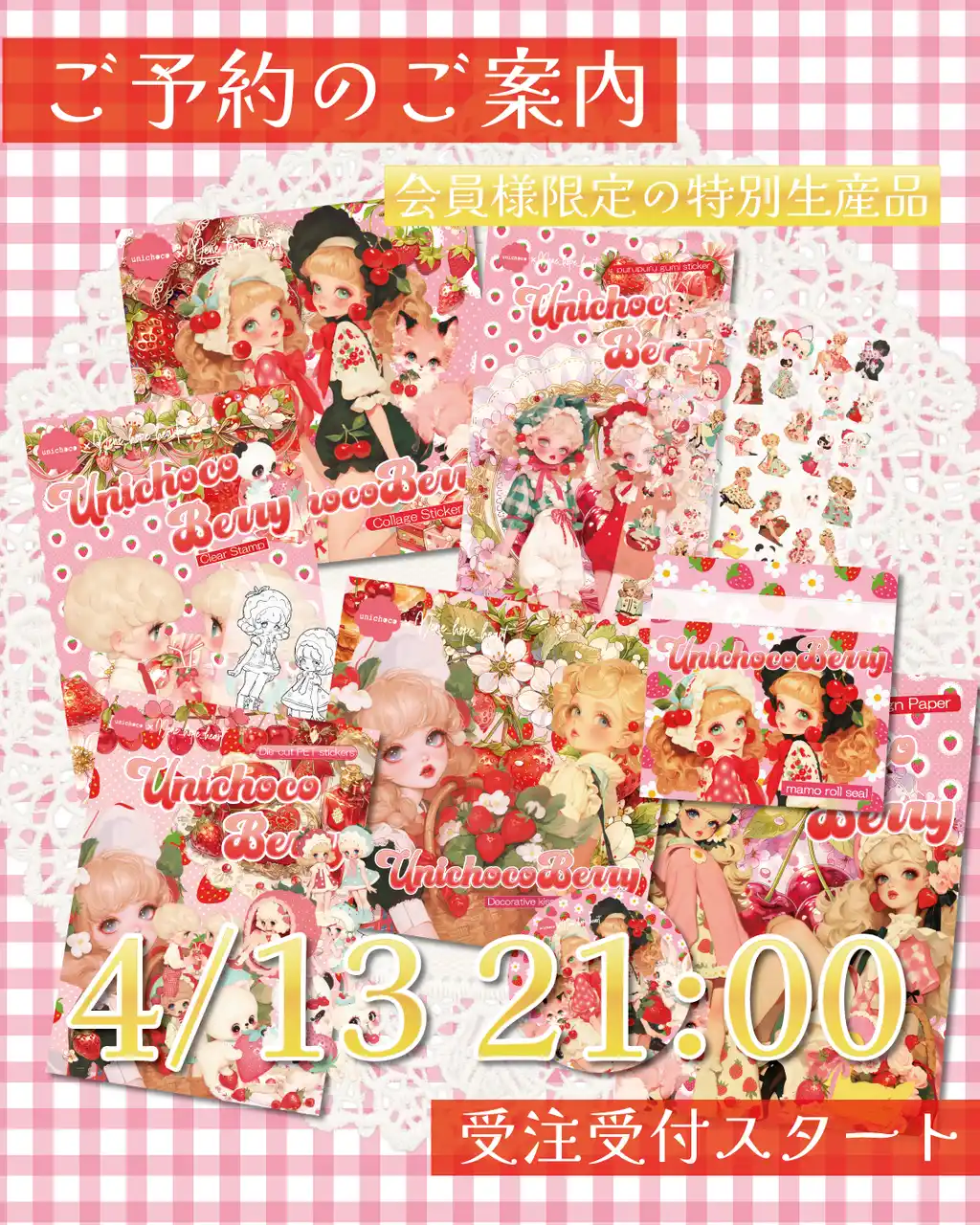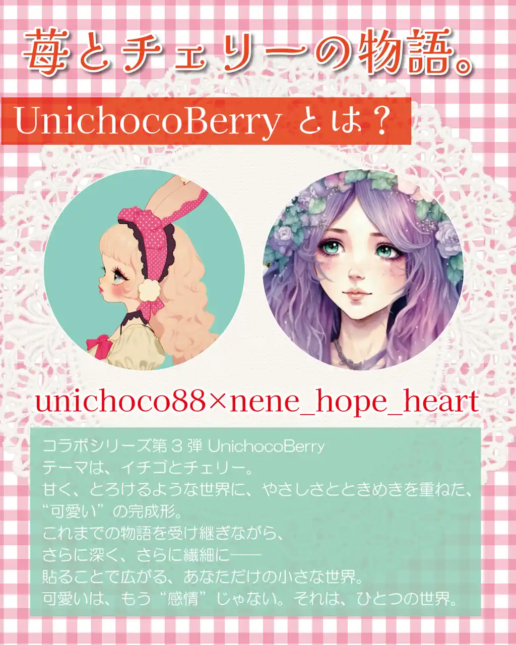 今回企画を実施した「UnichocoBerry」は、クリエイター・unichoco88とのコラボレーション商品であり、両者はSNS上で出会い、対面での打ち合わせを行わず、SNS上のコミュニケーションのみで企画・開発を進めました。本企画は、unichoco88とのコラボレーション第3弾となります。 |