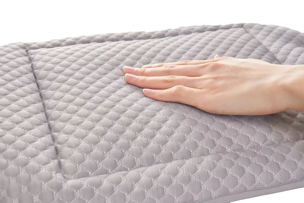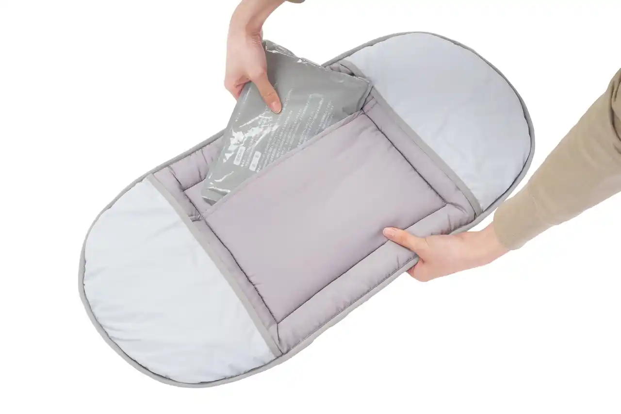 接触冷感素材と凹凸のキルティング構造により熱を逃がし、通気性を確保。裏面の保冷剤ポケットを併用することで、コット内の温度上昇を抑えます。 |