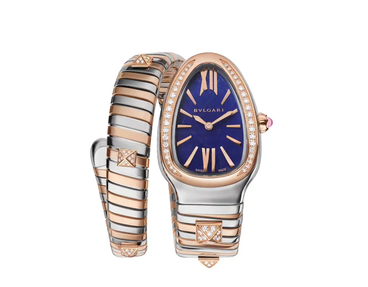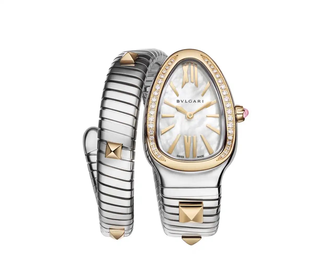 カプセル」は、ゴールドとステンレススティールのインスピレーションに満ちた邂逅を通じて、ジュエリーとウォッチのそれぞれを手がけるブルガリのスタイルとヴィジョンを体現するコレクションです。蛇の特徴がいかされたモチーフ、しなやかに巻きつくトゥボガスの形状、そしてスタッズという3つのアイコニックなクリエイション要素が相互に作用し、圧倒的なまでに美しいウォッチが形づくられています。
