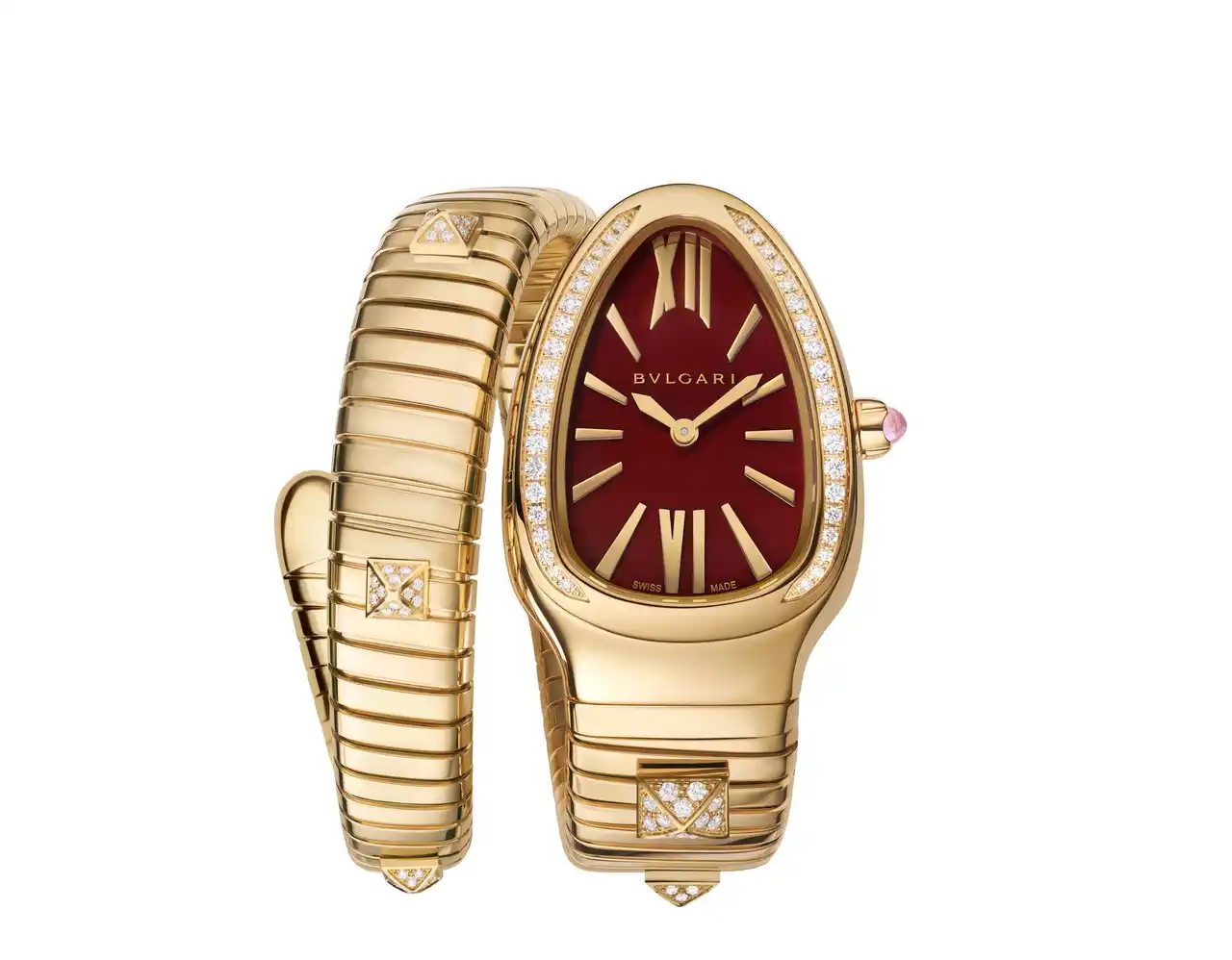 ブルガリのジュエリー哲学から生まれたスタッズが、しなやかなトゥボガスのブレスレットに独特の幾何学模様を加えます。ピラミッド型のファセットがトゥボガスの曲線美を強調し、ブレスレットを彫刻的なジュエリーへと変貌させます。今回スタッズはブルガリのジュエリーカテゴリでも、ブレスレットとネックレスのクリエイションに取り入れられます。ウォッチにおいては「セルペンティ トゥボガス」に採用され、センシュアルなトゥボガスのシルエットのクリエイションに新たな境地を加えました。 ポリッシュ仕上げ、および色石のセッティングにより、伝説的な生き物である蛇の、コンテンポラリーな魅力をさらに強く際立たせます。 |