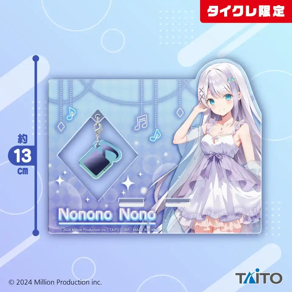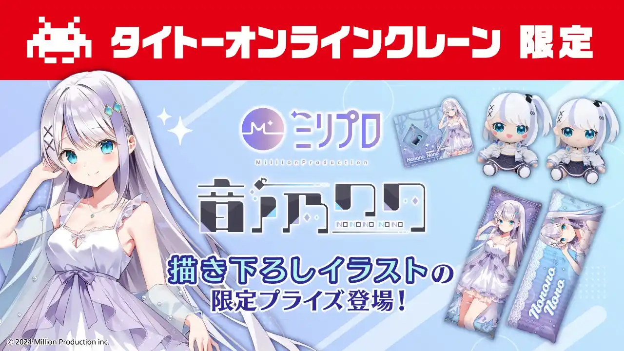 株式会社タイトー(本社:東京都新宿区、以下タイトー)が運営する、おうちでクレーンゲームが楽しめる「タイトーオンラインクレーン(以下タイクレ)」にて、株式会社Million Production(以下、ミリプロ)所属V Singer音ノ乃ののさんのプライズ全5種を4月17日(金)20時より展開します。今回のために新たに描き下ろした「ナイトウェア」イラストが使用されたタイクレでしか手に入らない限定プライズです。さらに、同日19時からは、YouTubeチャンネル「音ノ乃のの / NononoNono」にて、ご本人が限定プライズの獲得に挑戦する生配信を予定しています。 |