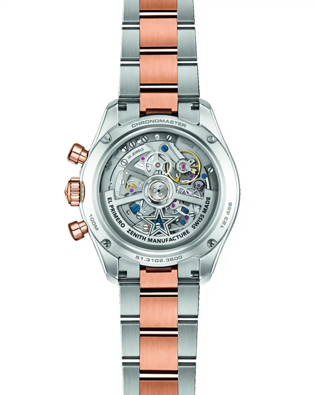 サファイアガラスのケースバックからは、コラムホイールと水平クラッチ構造を備えたムーブメンと、ゼニススターが刻まれたオープンワークのローターを眺めることができます。両方向巻き上げ機構は約60時間のパワーリザーブを実現し、この時計を特徴づけるリズムを安定して保ちます。 |