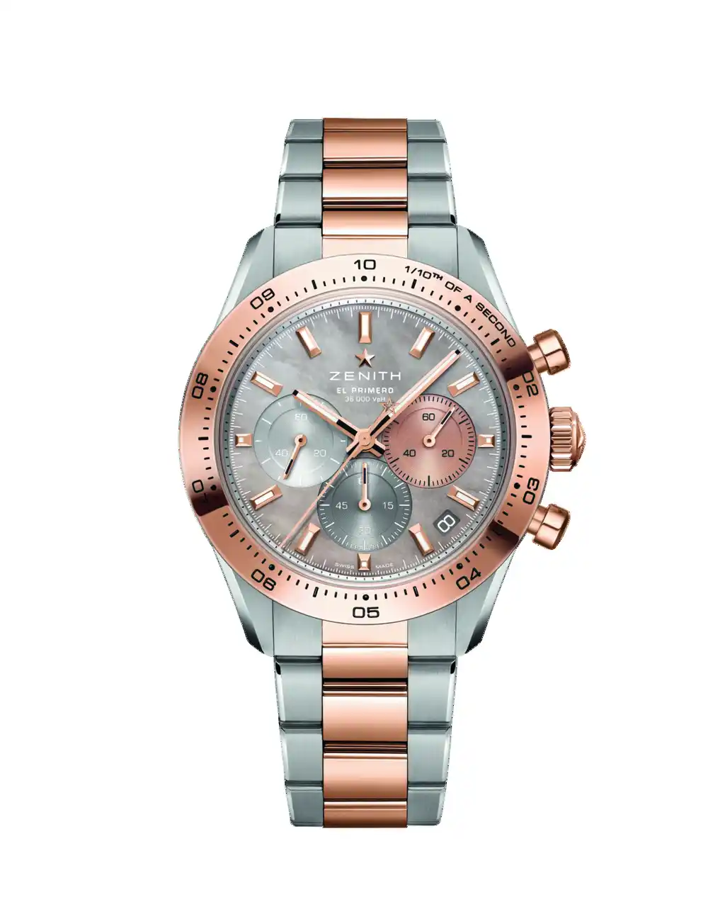 51.3102.3600/01.M3100 / エル・プリメロ 3600 自動巻 /パワーリザーブ 約60時間 / ステンレススティール・K18ローズゴールド / ケース径 41 mm / マザーオブパール文字盤 / 3色カンター / 10気圧防水 / ブラックラバーストラップ フォールディングバックル付属 / 2,695,000円(税込予価) |