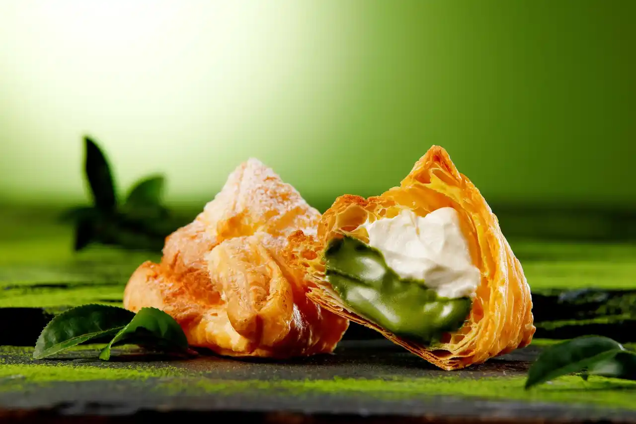 『ミルクパイ 宇治抹茶』は、自慢のサクサクパイに、宇治抹茶クリームと北海道ミルククリームを合わせました。宇治抹茶クリームは、抹茶香るほんのり苦みのある味わいに。北海道ミルククリームは、北海道でつくられた生クリーム、マスカルポーネチーズ、練乳で仕立て、まろやかな味わいに仕上げました。 |