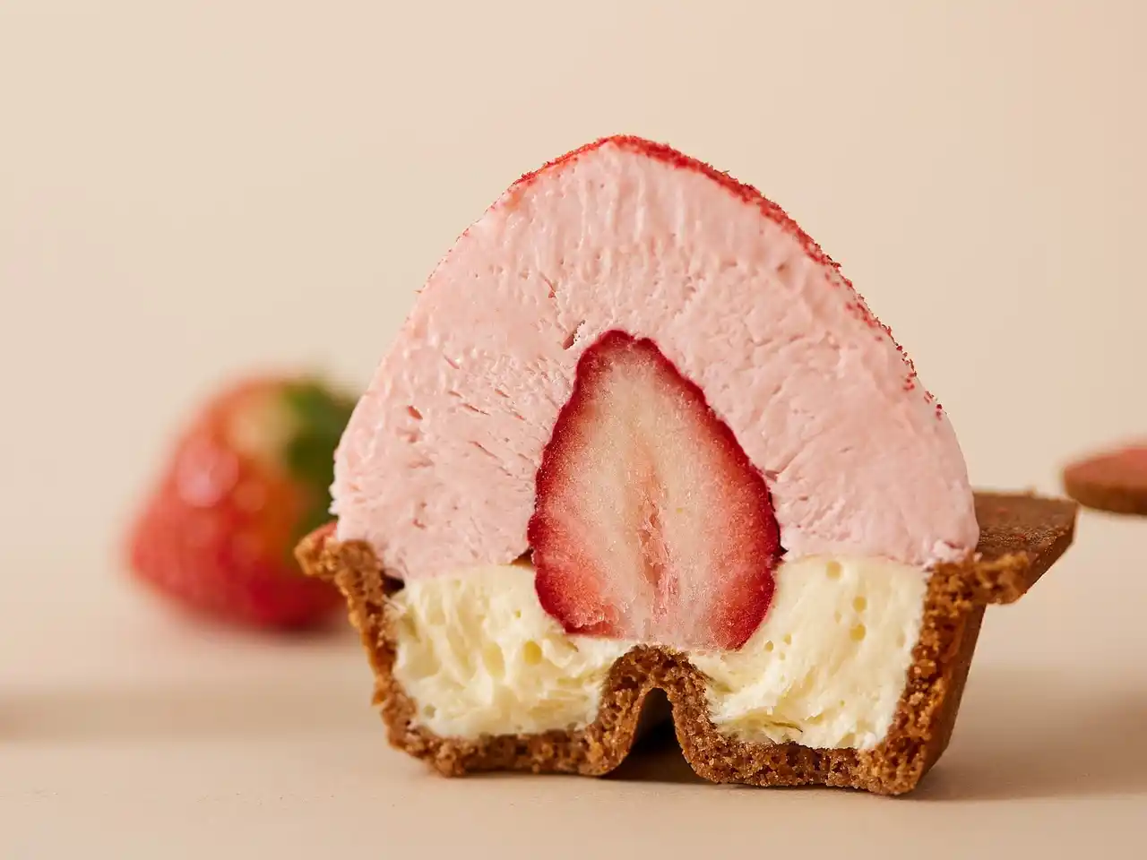 おすすめの食べ方は半解凍状態。ザクザクのクッキー、なめらかなムースの中から現れるのはひんやりとしたイチゴ。冷凍でお届けするからこそできた、フルーツアイスとチーズケーキの融合です。春の陽気に包まれながら口の中で溶けていくイチゴの食感をお楽しみください。 |