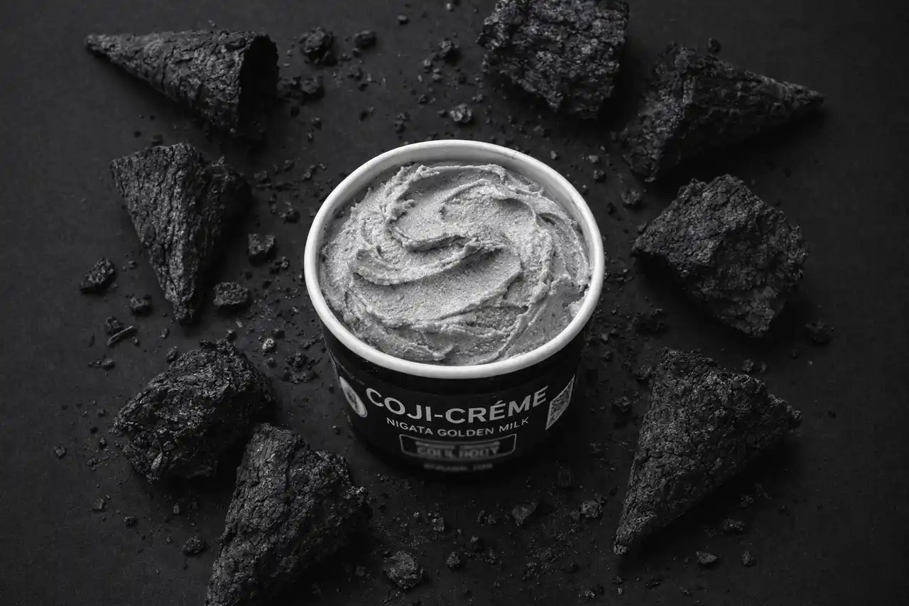 | 今回の『COJI-CREME』は、従来の固定観念にとらわれず、素材感・世界観・ブランド性を重ね合わせながら、“アイスクリームを食べる体験そのもの”をアップデートすることを目指して開発されました。 食べる炭を使用したユニークなコンセプトにより、ビジュアルのインパクトはもちろん、会話が生まれ、SNSでもシェアしたくなるような商品として仕上げています。 | |||||||||||
