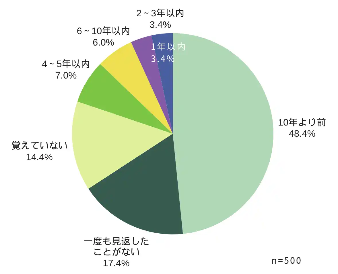 | 続いて、卒業アルバムを最後に見た時期について尋ねたところ、約48%が「10年以上前」と回答しました。多くの人が手元に残している一方で、日常的に見返しているわけではなく、“存在しているが開かれていない”状態にあることが分かります。 | ||||||||||