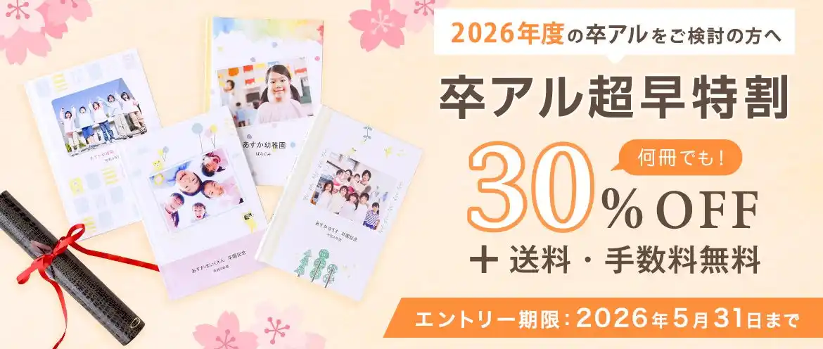 2026年度の卒アル(卒業アルバム)をご検討のご担当者さまへ、オトクに卒園・卒業アルバムをご注文いただけるキャンペーンを実施中です! 初めてマイブックをご利用される方はもちろん、前担当から引き継がれた方、継続して卒アルをご担当される方のエントリーもOKです♪ ぜひ2026年度もマイブック卒アルをご利用ください。 |