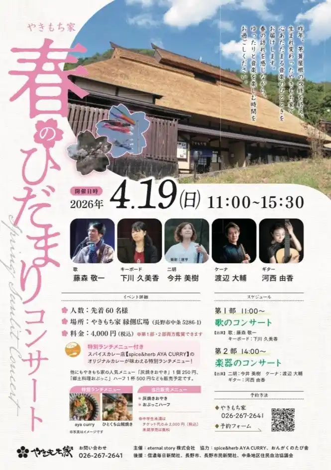 互恵株式会社グループのeternal story株式会社 (本社:長野県長野市、代表取締役:村上達哉)が運営する「やきもち家」(長野県長野市中条日下野5286-1)では、2026年4月18日(土)・19日(日)の2日間、音楽と食を楽しむ特別イベント「囲炉裏端コンサート」および「春のひだまりコンサート」を開催いたします。 |