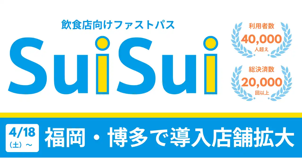 株式会社SuiSui(本社:栃木県那須塩原市/代表取締役:佐藤慶一郎)は、2026年4月18日(土)より、福岡・博多エリアの人気飲食店でファストパスサービス『SuiSui(スイスイ)』の導入を拡大いたします。ゴールデンウィークを控えた観光地・博多において、来訪者の観光体験をより快適にし、新たな外食の楽しみ方を提案する取り組みとして展開してまいります。なお、福岡・博多エリアでは既存導入店を含め、同日時点で計4店舗にて『SuiSui』をご利用いただける予定です。