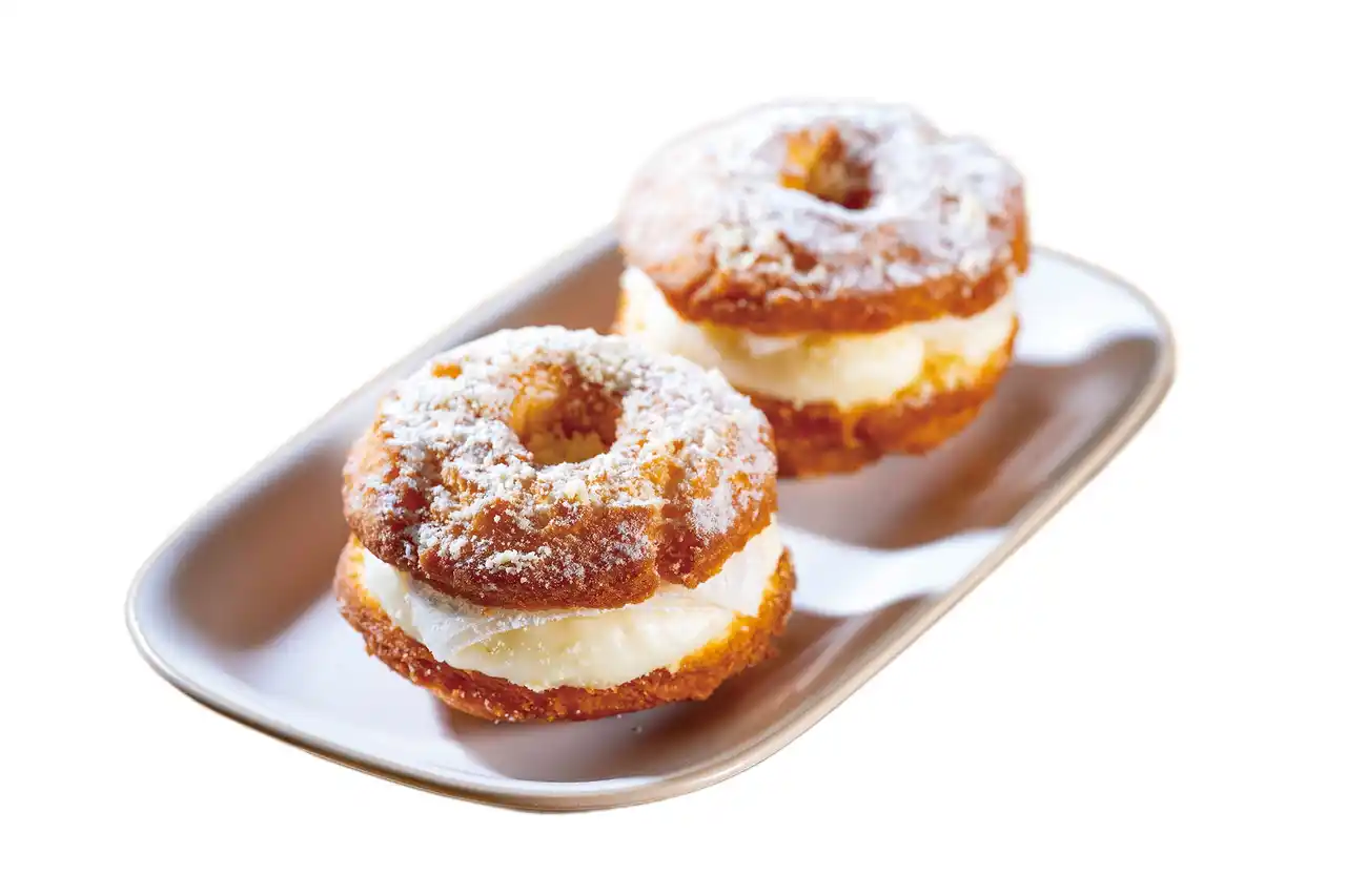 北海道産小麦を使用したやわらかしっとり食感が特徴の手作りドーナツに、求肥とチーズクリームを挟み込みました! |