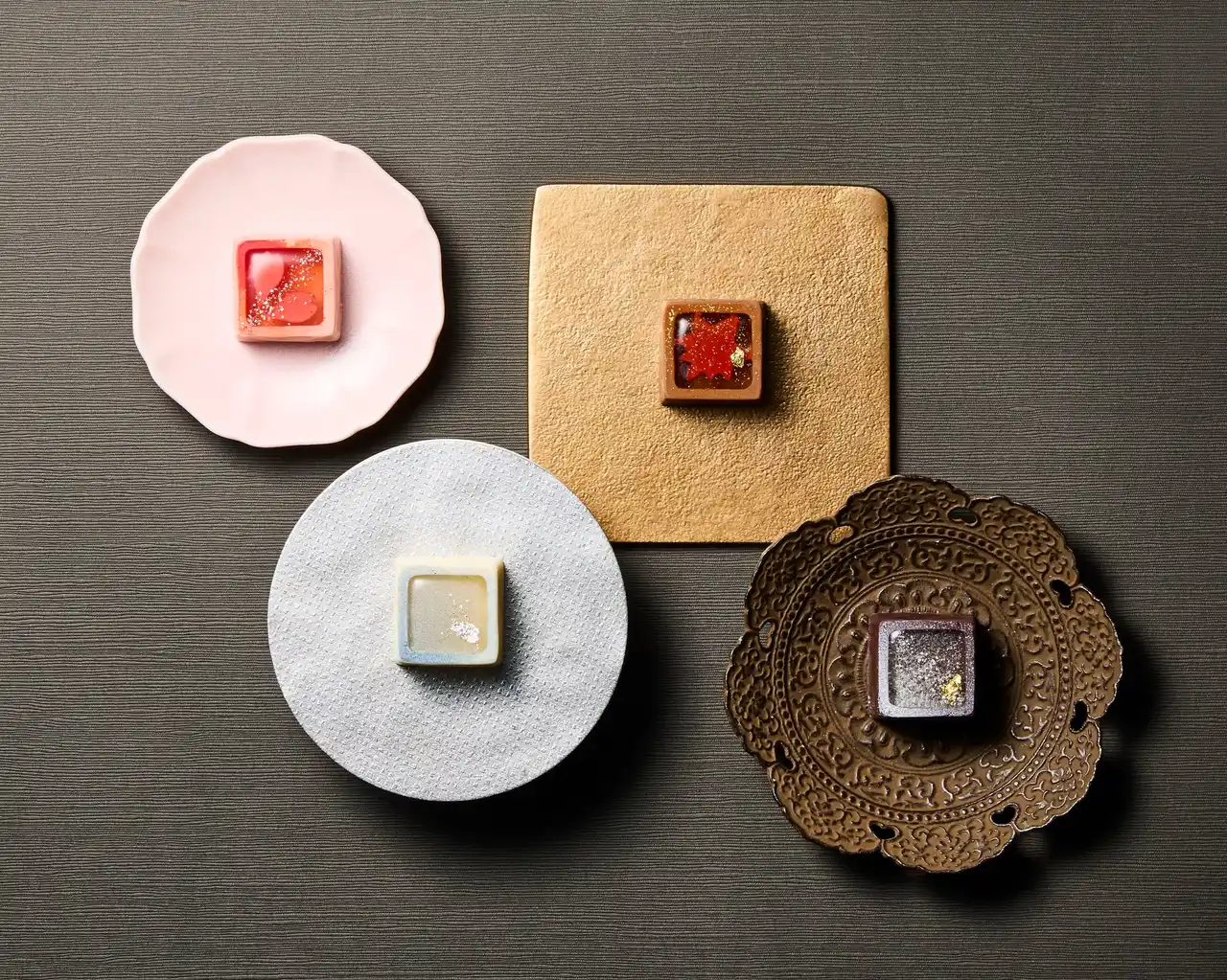 日本の四季の移ろいをジュレとショコラで表現した和モダンショコラです。枡に見立てたショコラの中には、京都ならではの爽やかな果実や華やかな香りのお茶、蜂蜜を丁寧に閉じ込めています。一粒ごとに季節の情景を映し出す繊細な味わいで、見た目の美しさと口どけの心地よさを両立。伝統的な素材選びと最新のショコラ技術が融合した、京都の季節を味わうひと粒です。 |