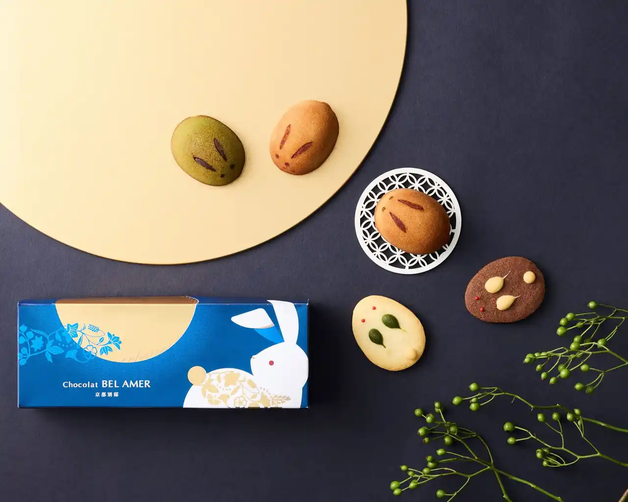 ・京のうさぎサブレ 芳醇なバターの香りと、サクッと軽やかな食感が広がるサブレ。コクのあるショコラと、素朴でやさしい甘みのプレーン、二つの味をご用意しました。月夜に跳ねるうさぎのように、心和むひとときを演出する焼き菓子です。 |