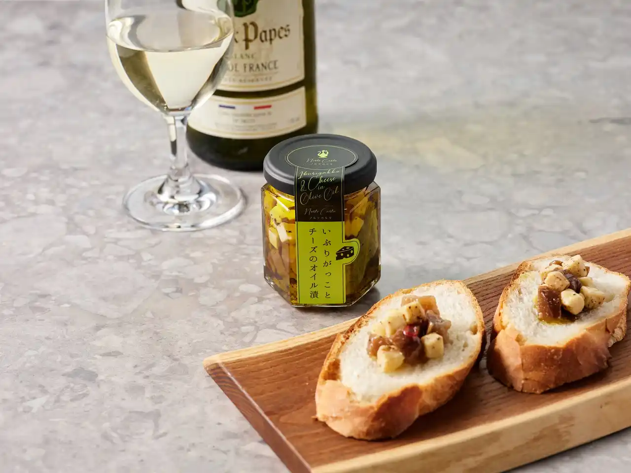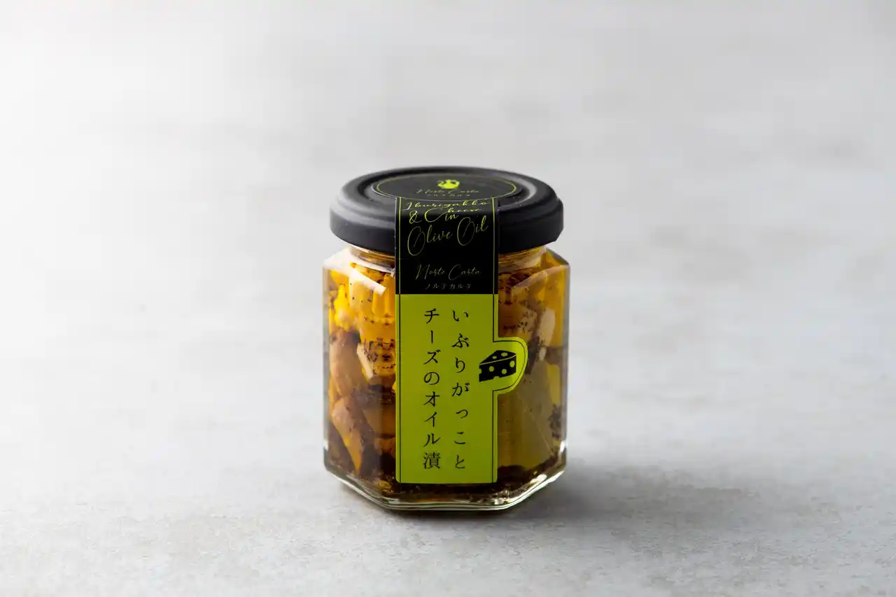 燻製の香りが特徴の「いぶりがっこ」とチーズをオイルで漬け込んだ商品 |