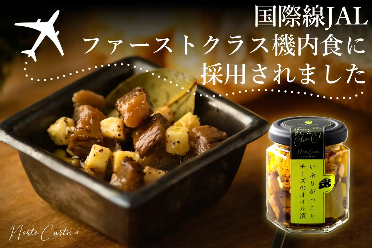株式会社ノルテカルタ(本社:秋田県山本郡八峰町、代表取締役:岡本 大介)は、同社が販売する人気商品「いぶりがっことチーズのオイル漬」が、国際線 日本航空(JAL)ファーストクラスの機内食メニューに採用されたことをお知らせいたします。 |