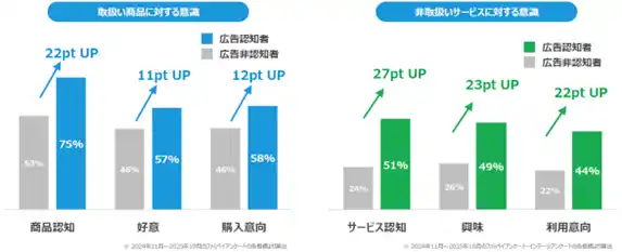 ファミリーマート非取扱いサービスに関する調査の結果、広告接触者のスコアは非接触者を大きく上回り、認知で+27pt、興味関心で+23pt、利用意向で+22ptの差が見られました。 |