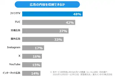 ・高い広告信頼度:社会インフラといえるコンビニの信頼性の高さが影響し、「広告の内容を信頼できるか」というアンケートにおいて、テレビ(41.9%)を超える47.7%の高い信頼性を獲得しています。 |