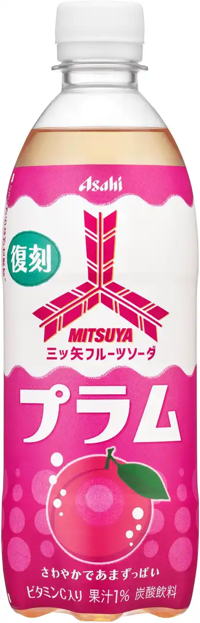 パッケージは、当時の象徴的な色合いをベースに、プラムのイラストと「三ツ矢」の矢羽根を大きく描きました。「復刻」のアイコンと「さわやかであまずっぱい」という文言を通じて、商品特長を分かりやすく訴求しています。 |