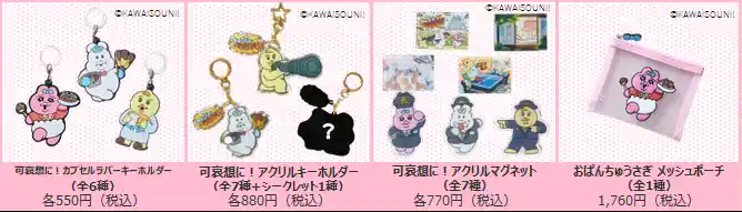 | 株式会社ジェイアール西日本デイリーサービスネット( 尼崎市潮江、代表取締役社長:中西 豊 )は、「おぱんちゅうさぎ」「んぽちゃむ」「きみまろ」を手掛けるクリエイター「可哀想に!」とのコラボ商品vol.1を、駅ナカ店舗にて2026年4月30日(木)より販売します! | ||||||||||||||||