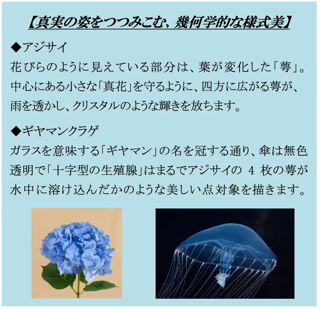 また、今年は日比谷花壇とのコラボレーションにより、“クラゲ×初夏の花々”が空間を鮮やかに彩ります。例えば、透明な傘に十字模様が浮かぶ「ギヤマンクラゲ」の水槽には、花びらのように見える萼(がく)が広がり中心の真花(しんか)をつつむ「アジサイ」を組み合わせた装飾を施しています。無色透明の傘に浮かぶ十字型の生殖腺がアジサイの4枚の萼を思わせる造形と呼応し、水中に溶け込むような美しさを描き出します。これらの組み合わせにより、クラゲと花が織りなすコラボレーション水槽が広がります。さらに、鏡面にはクラゲと花々のイメージをあしらったフォトスポットも登場。 |