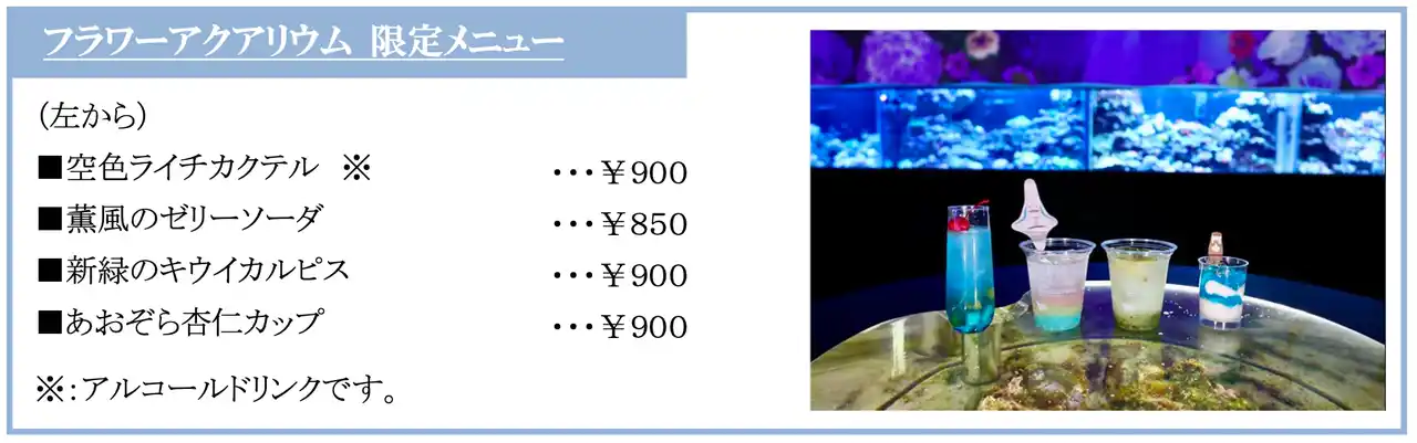 発光サンゴの水槽と初夏の花々が彩る“ガーデンカフェ”。庭園を照らす柔らかな日差しが描かれ、カウンター近くに並ぶ2つの円柱水槽にはホワイトパラソルを設置。涼やかでエキゾチックな空間を演出します。ライチ風味のカクテルやキウイ風味のドリンクをはじめ、初夏の涼しげな青空を表現したスイーツなど4種類のフラワーアクアリウム限定メニューをご用意。なお、ご購入いただいた商品は館内でのお持ち歩きが可能なので“庭園散策”のお供にオススメです。 |