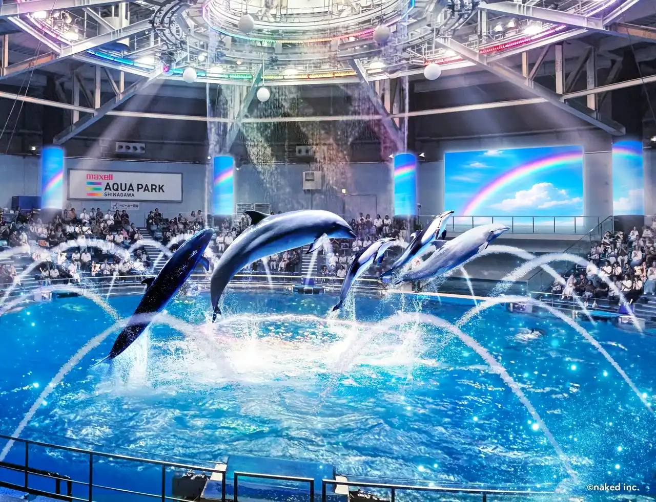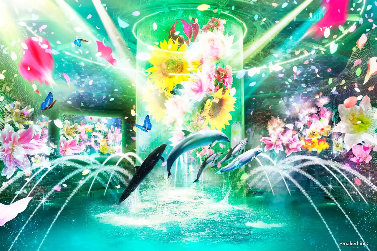 ライト、水中照明)】・【映像(プロジェクションマッピング、LEDビジョン)】・【音(12.1chサラウンド)】などのデジタルテクノロジーを駆使し、圧倒的な世界観を創出します。イルカたちのダイナミックなジャンプと呼応するように可憐なデジタルフラワーが次々と咲き、プログラム中盤では水のせせらぎと優美な蓮の花が揺れるシーンで水中パフォーマンスを展開。数々の美しい場面を経て、ゲストを“初夏の海”へ誘い、深い感動をお届けします。 |