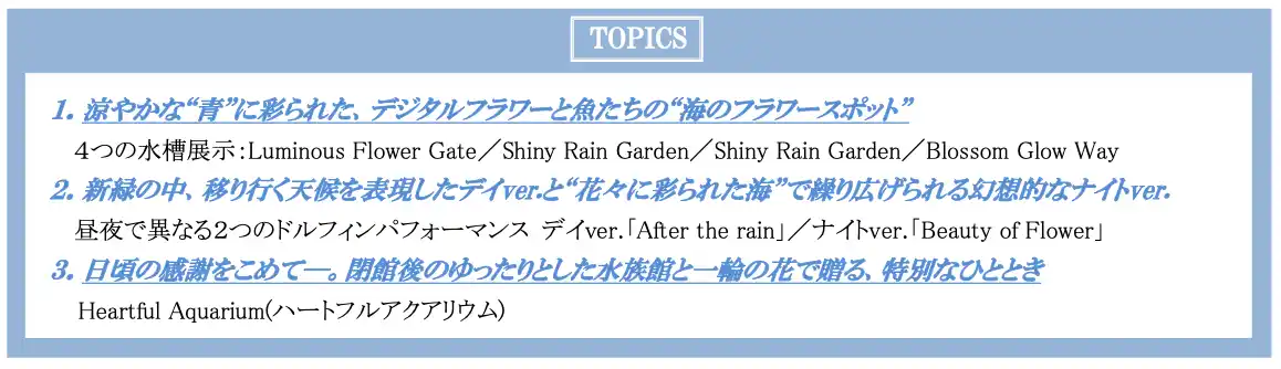 色彩豊かな花々とみずみずしい新緑、そして光に満ちた初夏。当館ではこの季節ならではの魅力をより鮮やかにお楽しみいただけるよう、涼やかな“青”を基調に初夏の花々が咲き誇る幻想的な“海の世界”を描き出します。全天候型施設の特性を活かし、暑さや紫外線、梅雨等の雨天時でも天候を気にせず快適にお過ごしいただける、“生きもの×お花”の唯一無二のエンターテインメントを創出します。 |