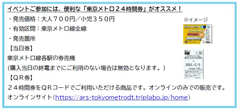 ※東京メトロ24時間券はついておりません。別途、交通費が必要となります。 |