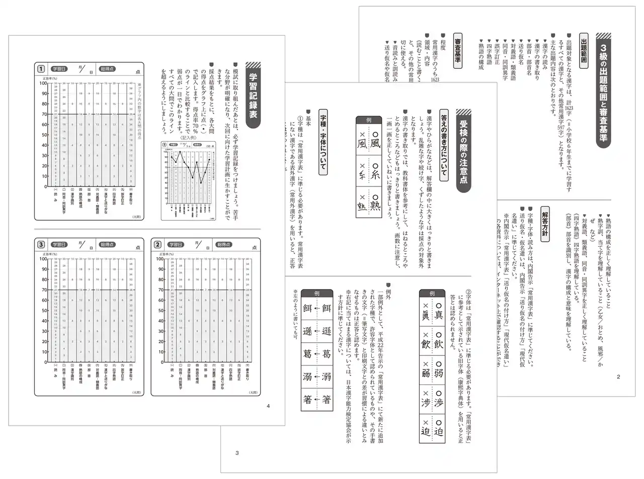 漢字検定を受けるにあたっての注意点や、自己採点の点数を記録する学習記録表つき。自分の弱点が把握しやすくなるので、効率的に学習することができます。 |